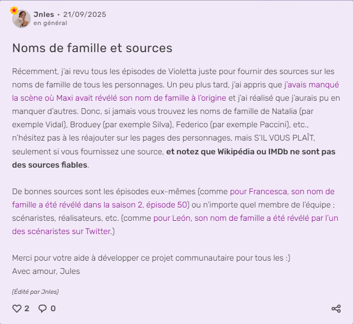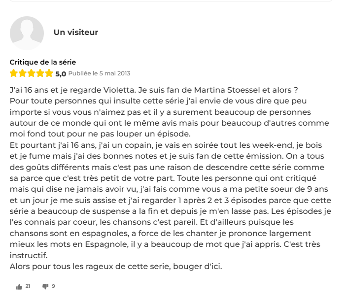 Henry Jenkins affirme que les fans sont des "lecteurs qui écrivent" : chaque commentaire ajoute une couche à l'histoire partagée. Certains défendent farouchement leur attachement : "J'ai 16 ans et je suis fan de cette émission. On a tous des goûts différents." Cette revendication révèle que Violetta n'est pas qu'un souvenir d'enfance rangé dans un tiroir. C'est une œuvre qu'on assume, qu'on protège, qu'on transmet. Le mur n'est plus un simple espace de réaction : il devient un lieu de socialisation où le temps se superpose, où passé et présent dialoguent, où l'attachement se réaffirme sans cesse. Violetta ne survit pas par les rediffusions télévisées. Elle survit parce que les fans entretiennent la flamme, commentaire après commentaire, défense après défense.